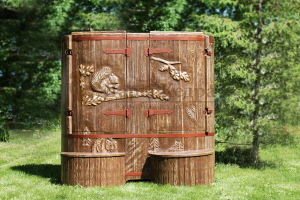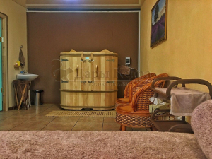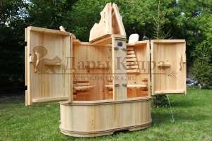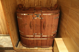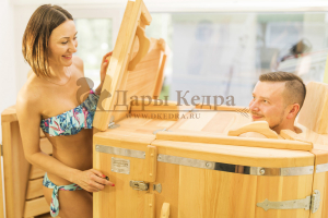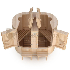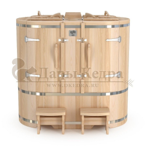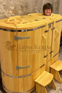 Двухместная фитобочка из кедра - это парная, в которой удобно принимать процедуры двум людям. Она оборудована откидными створками, дверцей, отверстием для головы и перегородкой (по желанию). Толщина стенок составляет 40-45 мм, что позволяет увеличить срок службы изделия. Во время парения человек находится внутри кедровой бочки, а голова снаружи. Благодаря этому исключается возможность перегрева. Подлокотники из кедра и внутренние ручки делают эксплуатацию фитобочки более удобной.