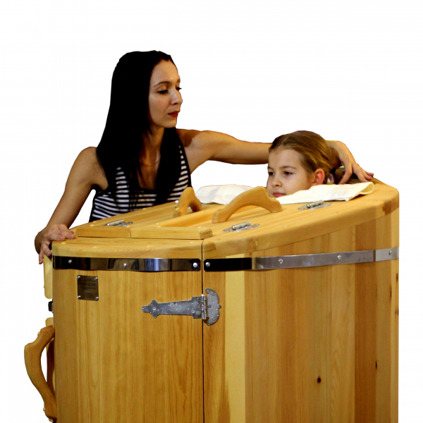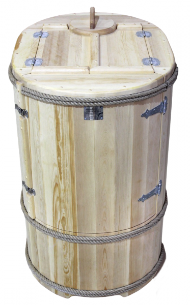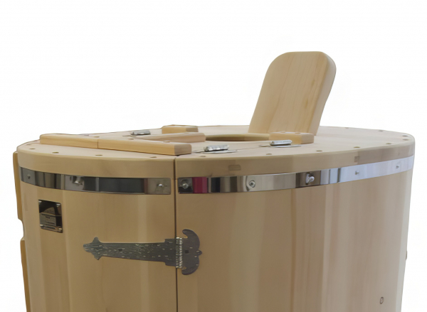 Это круглая фитобочка из кедра увеличенных размеров с толщиной стенок 45 мм. Подходит для людей высокого роста и крупной комплекции. Фитобочка оборудована откидными створками, дверцей и отверстием для головы. Верхний скос изделия делает положение головы более комфортным и улучшает обзор. Во время парения человек сидит внутри кедровой бочки, а голова находится снаружи. Благодаря этому исключается возможность перегрева. Подлокотники из кедра, встроенные ручки на створках и двери делают эксплуатацию более удобной.